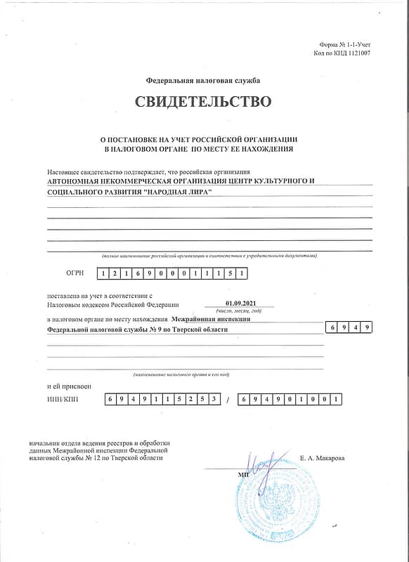 1.14. Полное название на иностранном языке: The autonomous non-profit organization CENTER FOR CULTURAL AND SOCIAL DEVELOPMENT «FolkLyre».